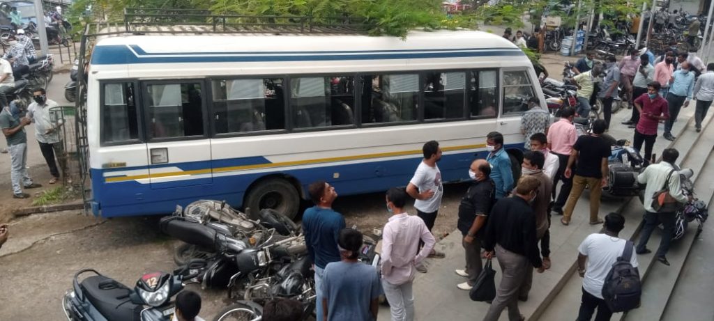 અકસ્માત બાદ બસ ઘુસી માધવ દર્શન કોમ્પ્લેક્સના પાર્કિંગમાં પાર્ક કરેલી અનેક બાઇકો નો કચરઘાણ વળ્યો ઇજાગ્રસ્તોને હોસ્પિટલ ખસેડાયા 20 થી વધુ બાઇકો ને થયું નુકશાન, બસ ચાલક ફરાર, પોલીસ સ્થળ પર પહોંચી