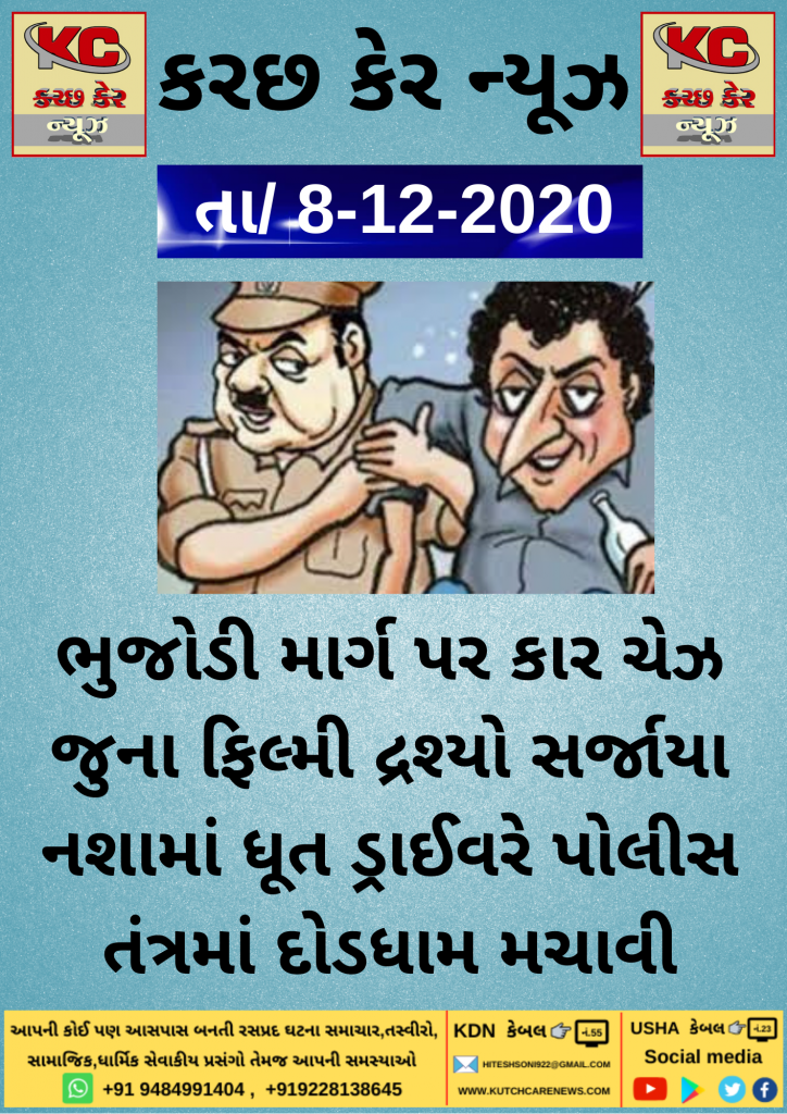 Kutch ભુજોડી માર્ગ પર કાર ચેઝ જુના ફિલ્મી દ્રશ્યો સર્જાયા નશામાં ધૂત ડ્રાઈવરે પોલીસ તંત્રમાં દોડધામ મચાવી 5 years ago Kutch Care News Continue Reading Previous કૃષિ વિરોધી ત્રણ કાળા કાયદાના વિરોધમાં સમગ્ર ભારત બંધના એલાન અંતર્ગત મુન્દ્રા મધ્યે વેપારીઓને વેપાર-ધંધા બંધ રાખવા માટે અપીલ કરવા નીકળેલ કોંગ્રેસી કાર્યકર્તાઓને મુંદ્રા પોલીસ દ્વારા ડિટેઇન કરવામાં આવ્યાNext ભુજ શહેરના નગર અધ્યક્ષા લતાબેન સોલંકીને કોરોના થી સંક્રમિત More Stories Breaking News Gujarat India Kutch નોકરીની શોધમાં ઘરેથી નીકળેલી ત્રણ સગીરાઓ દિલ્હીથી હેમખેમ મળી,પોલીસે કરાવ્યું પરિવાર સાથે મિલન 12 hours ago Kutch Care News Breaking News Gujarat India Kutch PM મોદીનો મલેશિયા પ્રવાસ:”વિશ્વ ભારતને ભરોસાપાત્ર ભાગીદાર તરીકે જોઈ રહ્યું છે” 13 hours ago Kutch Care News Breaking News Gujarat Kutch પ્રાઇવેટ ટ્યુશન ક્લાસમાં વિદ્યાર્થીઓની સુરક્ષા માટે સરકાર અને તંત્ર કડક 14 hours ago Kutch Care News