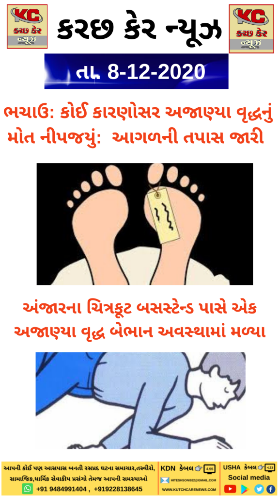 Crime Kutch ભચાઉ: કોઈ કારણોસર અજાણ્યા વૃદ્ધનું મોત નીપજયું: આગળની તપાસ જારી 5 years ago Kutch Care News Continue Reading Previous ભુજ શહેરના નગર અધ્યક્ષા લતાબેન સોલંકીને કોરોના થી સંક્રમિતNext ભચાઉમાં આવેલ ખારોઈ ગામ નજીક સ્કોર્પિયો કારએ બાઈકને ટક્કર મારતા યુવકનું મોત નીપજયું More Stories Breaking News Gujarat India Kutch નોકરીની શોધમાં ઘરેથી નીકળેલી ત્રણ સગીરાઓ દિલ્હીથી હેમખેમ મળી,પોલીસે કરાવ્યું પરિવાર સાથે મિલન 12 hours ago Kutch Care News Breaking News Gujarat India Kutch PM મોદીનો મલેશિયા પ્રવાસ:”વિશ્વ ભારતને ભરોસાપાત્ર ભાગીદાર તરીકે જોઈ રહ્યું છે” 13 hours ago Kutch Care News Breaking News Gujarat Kutch પ્રાઇવેટ ટ્યુશન ક્લાસમાં વિદ્યાર્થીઓની સુરક્ષા માટે સરકાર અને તંત્ર કડક 14 hours ago Kutch Care News