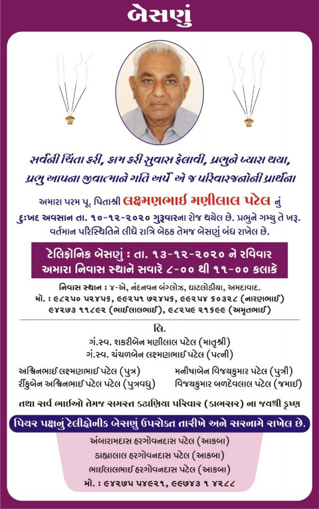 શ્રી આર.કે.ગોધાણિ :સિટિ સરવે સુપ્રી.. & ઇ.ચા. ડી. આઈ. એલ. આર તાપી મુ.વ્યારાનું દુઃખદ અવસાન થયેલ છે. પરમ કૃપાળુ પરમાત્મા સદગતની આત્મા ને શાંતિ અર્પે એવી પ્રાર્થના