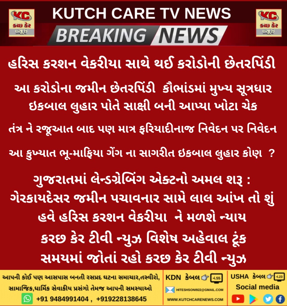 Breaking News હરિસ કરશન વેકરીયા સાથે થઈ કરોડોની છેતરપિંડી 5 years ago Kutch Care News Continue Reading Previous મેઘપર હરોડા વચ્ચેના સીમાડામાં બપોરે લાગેલી આગ મોડી રાતે બેકાબુ બની ૨૦૦ એકર નો ધાસ ચારો બળી ખાખNext લખપત ની નાની મુંધવાય સીમમાં આગ લાગતા ચાર એકર જમીનનું ઘાસ ભસ્મીભૂત More Stories Breaking News Gujarat India Kutch નોકરીની શોધમાં ઘરેથી નીકળેલી ત્રણ સગીરાઓ દિલ્હીથી હેમખેમ મળી,પોલીસે કરાવ્યું પરિવાર સાથે મિલન 12 hours ago Kutch Care News Breaking News Gujarat India Kutch PM મોદીનો મલેશિયા પ્રવાસ:”વિશ્વ ભારતને ભરોસાપાત્ર ભાગીદાર તરીકે જોઈ રહ્યું છે” 13 hours ago Kutch Care News Breaking News Gujarat Kutch પ્રાઇવેટ ટ્યુશન ક્લાસમાં વિદ્યાર્થીઓની સુરક્ષા માટે સરકાર અને તંત્ર કડક 14 hours ago Kutch Care News
