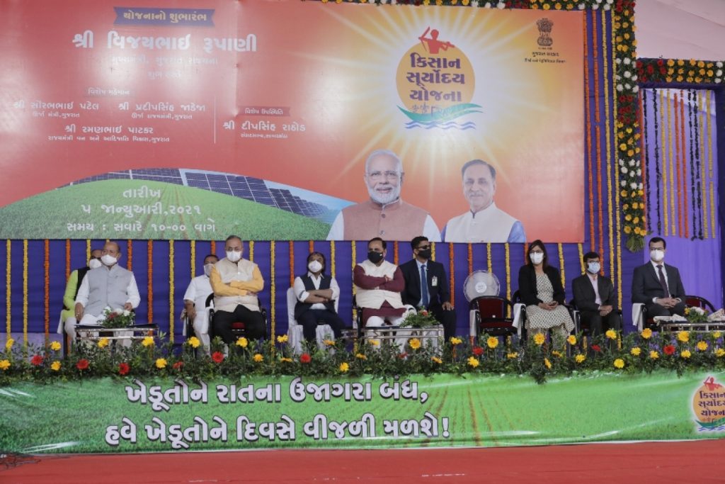 જયોતિગ્રામ યોજના પછીની સૌથી મોટી ઐતિહાસિક યોજના ” કિસાન સૂર્યોદય યોજના :ખેડૂતો માટે દિવસે કામ રાત્રે વિશ્રામને સાકાર કરશે – મુખ્યમંત્રીશ્રી વિજયભાઇ રૂપાણી – મુખ્યમંત્રીશ્રીએ અરવલ્લી જિલ્લાના બાયડ ખાતેથી કિસાન સૂર્યોદય યોજનાના બીજા તબક્કાના ઉત્તર ગુજરાતમાં પ્રથમ ચરણનો પ્રારંભ કરાવ્યો – ઉત્તર ગુજરાતના ૬૦૦ ગામોને આજથી ગુણવત્તાયુકત વીજ પુરવઠો મળશે. રાજયના ગામોને તબકકાવાર યોજનામાં આવરી લેવાશે – ઉર્જા વિભાગે ખેડૂતોની ચિંતા કરી છે- ખેડૂતોનો ખર્ચ ઘટે આવક બમણી થાય તેવું આયોજન કર્યુ છે દરેક વસ્તુનો સંગ્રહ કરી શકાય પણ વીજળીનો સંગ્રહ કરી શકતો નથી – ઊર્જા મંત્રી શ્રી સૌરભભાઇ પટેલ – કિસાન સૂર્યોદય યોજનાથી કૃષિમાં ઉત્પાદનમાં વધારો થશે કિસાનોની આવક બમણી થશે – જિલ્લા પ્રભારીમંત્રીશ્રી રમણભાઇ પાટકર