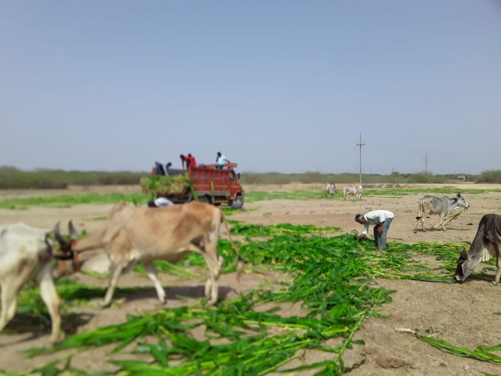 ભુજ નવી જથ્થાબંધ શરાફ બજાર ગૌસેવા સમિતિના માધ્યમથી અબડાસા તાલુકાના મોટા કરોડીયા ગામે મોમાઈ માતાજીના સતરમાં પાટોત્સવ નિમિત્તે દાતા કેશવજી મેઘરાજ અભાણીના આર્થિક સહયોગથી ગામનાં ૪૫૦ ગૌવંશજોને ૭,૨૮૦ કિલો લીલી મકાઈના ઘાસચારાનું ગામની ગૌસેવા સમિતિના ગૌભક્તો અને ભુજ નવી જથ્થાબંધ શરાફ બજાર ગૌસેવા સમિતિના પણ ગૌભક્તોની જહેમત થકી નિરણ સત્કર્મ સંપન્ન કરાયું હતું સાથે સાથે શ્વાનોને રોટલાઓ અને રોટલીઓનાં નિરણ અને પક્ષીઓને જુદા જુદા ધાનોના નિરણ કરાવવામાં આવ્યાં હતાં એવું ભુજ નવી જથ્થાબંધ શરાફ બજાર ગૌસેવા સમિતિના મુખ્ય અધ્યક્ષ સચીન ડી. ગણત્રાએ જણાવ્યું હતું સમિતિમાં પરોપકારી પ્રવૃત્તિમાં દાન માટે +919825088096 આ નંબર પર સંપર્ક કરી રૂબરૂમાં આપી શકે છે સકારાત્મક સહયોગ.