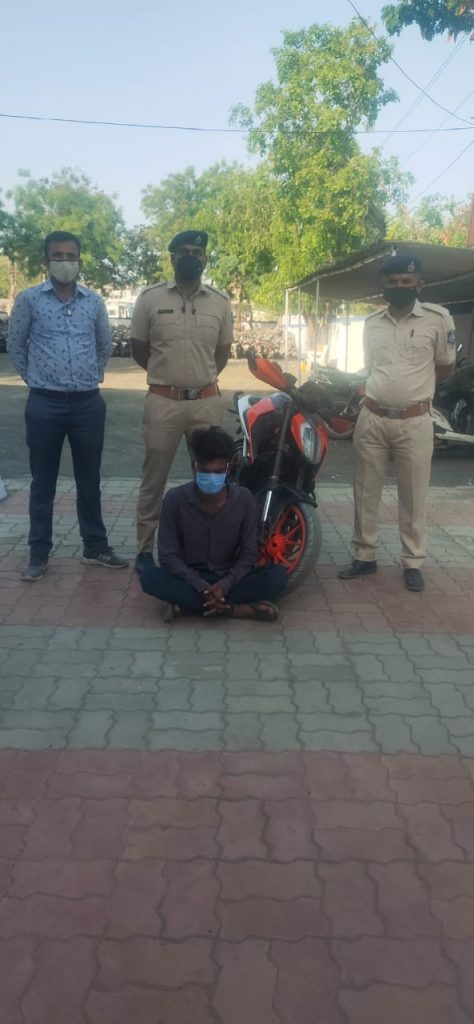સરહદી રેન્જ ભુજના મહે.પોલીસ મહાનિરીક્ષક સા.શ્રી જે.આર. મોથાલીયા સાહેબ તથા પુર્વ-કચ્છ ગાંધીધામના પોલીસ અધિક્ષક શ્રી મયુર પાટીલ સાહેબ પુર્વ કચ્છ ગાંધીધામ નાઓ તથા નાયબ પોલીસ અધિક્ષક શ્રી ડી.એસ.વાઘેલા સાહેબ અંજાર વિભાગ અંજારનાઓની સૂચના આધારે ચોરીના ગુના શોધી કાઢવા સૂચના હોઇ જેથી અંજાર પોલીસ ઇન્સપેક્ટરશ્રી એમ.એન રાણા સા. નાઓની સૂચના આધારે સ્ટાફના માણસો અંજાર ટાઉન વિસ્તારમા પટ્રોલીંગમાં હતા તે દરમ્યાન દેવળીયા નાકા પાસે આવી શક પડતા વાહન ની ચેકિંગ કરતા હતા તે દરમ્યાન એક મો.સા નંબર પ્લેટ વગરનું નિકળતા તેને ઉભુ રખાવી ચેક કરતા તેનો ચાલક સંતોષ કારક જવાબ આપતો ન હોઈ અને ગલ્લા તલ્લા કરવા લાગેલ મો.સા. ના ચાલકનું નામ-ઠામ પુંછતા તેણે પોતાનું નામ મહેશ ઉર્ફે ડાબલો મોતીભાઈ ગાંગસ (કોલી) ઉ.વ.રર રહે.કોલીવાસ, અંજાર-ભુજ બાઈપાસ રોડ,વિજયનગર, અંજાર વાળો હોવાનું જણાવેલ જેના કબ્જામાં રહેલ મો.સા. જોતા કેસરી કલરનું કે.ટી.એમ. કંપનીનું મો.સા. હોઈ જેમાં આગળ-પાછળ નંબર પ્લેટ લાગેલ ન હોઈ જેના એન્જીન નં-793814378 તથા ચેસીસ નં-MD 2 JPJYB 4 HC 222816 વાળા લખેલા હોઈ જેથી મજકુર ઈસમ પાસે તેના કબ્જામાં આ મો.સા. રાખવા અંગે કોઈ આધાર પુરાવા કે બીલ હોઈ તો રજુ કરવા જણાવતા પોતા પાસે આ વાહનના કોઈ આધાર પુરાવા ન હોવાનું જણાવેલ જેથી મજકુર ઈસમ આ મો.સા. કોઈ જગ્યાએથી ચોરી કે છળ કપટથી મેળવેલ હોવાનું જણાતાં તેની કિ.રૂ.૯૦,૦૦૦/૦૦ ગણી શક પડતાં મુદ્દામાલ તરીકે Cr.p. c કલમ-૧૦ર મુજબ કબ્જે કરી મજકુર ઈસમને તેના અટકાયતના કારણોની સમજ કરી Cr.p.c કલમ-૪૧(૧)(ડી) મુજબ ધોરણસર અટક કરેલ અને આગળની કાર્યવાહિ કરવામા આવેલ છે. શોધવામા આવેલ વણ શોધાયેલ ગુનો માંડવી પોલીસ સ્ટેશન ગુ.ર.ન ૧૧૨૦૫૦૩૧૨૧૦૨રર/ર૦૨૧ ઇ.પી.કો- ૩૭૯ મુજબ ધોરણસર અટક કરેલ અને આગળની કાર્યવાહી કરવામાં આવેલ છે.