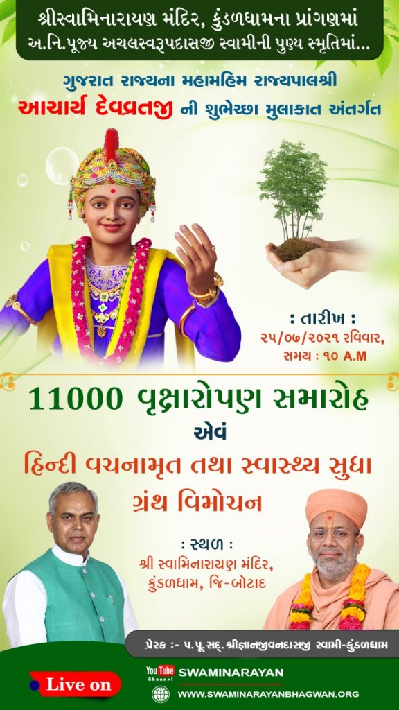રાજ્યપાલ તથા પૂજ્ય જ્ઞાનજીવનદાસજી સ્વામીના હસ્તે ૧૧૦૦૦ વૃક્ષોનું વૃક્ષારોપણ તથા વિતરણ કરાશે.