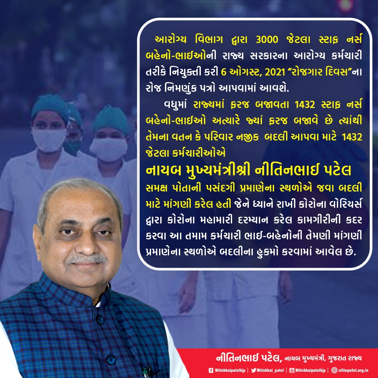 કોરોના વોરીયર્સ તરીકે કામગીરીને બિરદાવી ૧૪૩૨ સ્ટાફ નર્સ ભાઈઓ બહેનોને તેમના વતન કે પરિવારની નજીક બદલી અપાઈ.આરોગ્ય મંત્રી નિતિન પટેલે બદલીના હુકમો કર્યા.રોજગાર દિવસે જ નવા ૩૦૦૦ સ્ટાફ નર્સની નિમણૂક