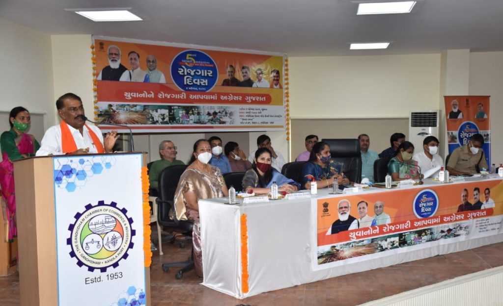 સ્વાગત પ્રવચનમાં ગાંધીધામ કચ્છ ના મદદનીશ શ્રમ આયુક્ત જી.એમ. ભુટકાએ કચ્છ જિલ્લામાં રોજગારી અંગે વિગતો આપતાં જણાવ્યું હતું કે “રોજગાર દિવસ નિમિત્તે જિલ્લામાં કુલ ૫૨ સ્થળોએ કાર્યક્રમ યોજાઈ રહ્યા છે જે પૈકી ગાંધીધામ અને ભુજ ખાતેના કાર્યક્રમમાં કુલ ૫૫૦ ઉમેદવારો પૈકી ગાંધીધામ ખાતે ૧૪૩ યુવાઓને નિમણુંક અને રોજગારી પત્રો એનાયત કરવામાં આવશે.કોવિડ ગાઇડ લાઇનને ધ્યાને લઈને રોજગાર દિવસ નિમિત્તે જિલ્લામાં શિક્ષણ, કૃષિ અને સહકાર, નાણાં, આરોગ્ય, બંદરો અને પરિવહન તેમજ શ્રમ અને રોજગાર વિભાગમાં કુલ ૪૦૪૦ ઉમેદવારોમાં અન્ય ઉમેદવારોને જે તે સંબંધિત નોકરીદાતાઓ મારફતે નિમણૂક પત્ર રોજગાર પત્ર આપવામાં આવશે.”