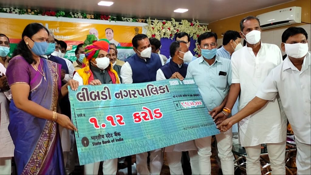 રાજ્યભરમાં હાથ ધરાયેલ “૫ વર્ષ આપણી સરકારના, સૌના સાથ-સૌના વિકાસના” જન સેવાયજ્ઞના આઠમા દિવસે ‘શહેરી જન સુખાકારી દિવસ’ નિમિત્તે સરકારના શહેરી વિકાસ વિભાગ અને શહેરી ગૃહ નિર્માણ વિભાગ દ્વારા રાજ્યની નગરપાલિકાઓના વિવિધ વિકાસના કાર્યોનું ઈ-ખાતમુહૂર્ત-લોકાર્પણ કરવામાં આવ્યા સુરેન્દ્રનગર જિલ્લાના લીંબડી ખાતે નાયબ મુખ્યમંત્રી નીતિનભાઈ પટેલની અધ્યક્ષતામાં મનદીપ હોલ ખાતે યોજાનાર કાર્યક્રમમાં જિલ્લાની નગરપાલિકાઓના વિવિધ વિકાસના કામોના ચેક વિતરણ કરવામાં આવ્યા હતા