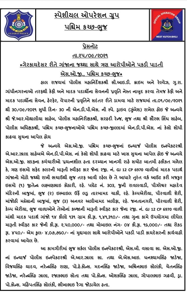 Crime ગેરકાયદેસર રીતે ગાંજાના જથ્થા સાથે ત્રણ આરોપીઓને પકડી પાડતી એસ.ઓ.જી., પશ્ચિમ કચ્છ-ભુજ 4 years ago Kutch Care News Continue Reading Previous ભુજમાં એક ચાયની કેબીનમાં ગાંજો વેંચતા શખ્સને ઝડપી પાડ્યોNext કેદી જાપ્તામાંથી ફરાર થયેલ હત્યાના આરોપીને પકડી પાડતી આડેસર પોલીસ More Stories Breaking News Crime Kutch “ખાવડા પોલીસ સ્ટેશન વિસ્તારમાંથી આધાર પુરાવા વગરના ગાંડા બાવળોના લીલા લાકડાના જથ્થા સાથે બે ઇસમોને પકડી પાડતી લોકલ ક્રાઇમ બ્રાન્ય પશ્ચિમ કચ્છ ભુજ” 10 hours ago Kutch Care News Crime Kutch મુંદ્રાના ધ્રબમાં યાર્ડ ચેકર તરીકે નોકરી કરનાર 42 વર્ષીય આધેડનું ટ્રેઈલરની હડફેટે મોત 12 hours ago Kutch Care News Breaking News Crime Kutch ભુજમાં ચાલી રહેલી કથાના મુંદ્રાના યજમાનને આપવામાં આવેલ ઉતારામાં ચોર ઈશમોએ ખાતર પાડ્યું : લાખોની મત્તા લઈ થયા ફરાર 15 hours ago Kutch Care News
