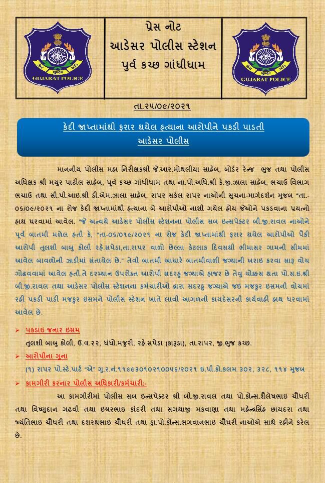 Crime કેદી જાપ્તામાંથી ફરાર થયેલ હત્યાના આરોપીને પકડી પાડતી આડેસર પોલીસ 4 years ago Kutch Care News Continue Reading Previous ગેરકાયદેસર રીતે ગાંજાના જથ્થા સાથે ત્રણ આરોપીઓને પકડી પાડતી એસ.ઓ.જી., પશ્ચિમ કચ્છ-ભુજNext ગેરકાયદેસર રીતે ગાંજાના જથ્થા સાથે ત્રણ આરોપીઓને પકડી પાડતી એસ.ઓ.જી., પશ્ચિમ કચ્છ-ભુજ More Stories Breaking News Crime Kutch “ખાવડા પોલીસ સ્ટેશન વિસ્તારમાંથી આધાર પુરાવા વગરના ગાંડા બાવળોના લીલા લાકડાના જથ્થા સાથે બે ઇસમોને પકડી પાડતી લોકલ ક્રાઇમ બ્રાન્ય પશ્ચિમ કચ્છ ભુજ” 10 hours ago Kutch Care News Crime Kutch મુંદ્રાના ધ્રબમાં યાર્ડ ચેકર તરીકે નોકરી કરનાર 42 વર્ષીય આધેડનું ટ્રેઈલરની હડફેટે મોત 12 hours ago Kutch Care News Breaking News Crime Kutch ભુજમાં ચાલી રહેલી કથાના મુંદ્રાના યજમાનને આપવામાં આવેલ ઉતારામાં ચોર ઈશમોએ ખાતર પાડ્યું : લાખોની મત્તા લઈ થયા ફરાર 15 hours ago Kutch Care News