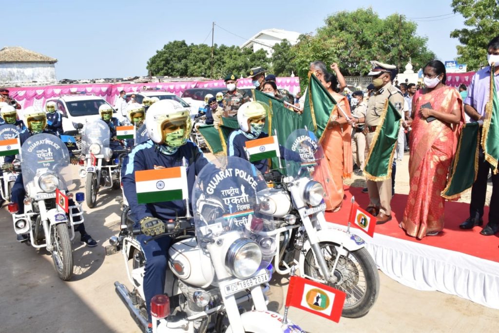 સરદાર વલ્લભભાઇ પટેલની ૧૪૬મી જન્મજયંતી નિમિત્તે યોજાયેલ રાષ્ટ્રીય એકતા દિવસ ની ગુજરાત પોલીસ પશ્ચિમ કચ્છ દ્વારા આયોજિત રાષ્ટ્રીય એકતા બાઇક રેલીનું પ્રસ્થાન પશ્ચિમ કચ્છ લખપત ખાતેથી વિધાનસભાના અધ્યક્ષા ડો. નીમાબેન આચાર્યે કરાવ્યું હતું. ગુજરાત પોલીસ પશ્ચિમ કચ્છ પોલીસ દ્વારા યોજાયેલી આ રાષ્ટ્રીય એકતા બાઇક રેલીનું પ્રસ્થાન કરાવતા વિધાનસભા અધ્યક્ષા ડો. નીમાંબેન આચાર્યે જણાવ્યું હતું કે સ્ટેચ્યુ ઓફ યુનિટીએ ૫૬૨ રજવાડાઓ નું એકત્રિકરણ કરનારા અખંડ ભારતના શિલ્પી સરદાર વલ્લભભાઇ પટેલની અકલ્પ્ય કોઠાસૂઝને અમર કરી દીધી છે. વિશ્વમાં સૌથી ઉંચી પ્રતિમા ૧૮૨ ફૂટની સ્ટેચ્યુ ઓફ યુનિટીને ખેડૂતોના ઓજારો દ્વારા નિર્માણ કરીને તેમના રાષ્ટ્રીય હિતના અને ખેડૂતોના કરેલા જનઆંદોલન ને જીવંત કર્યા છે. ૧૩૫ મેટ્રિક ટન લોખંડ એકત્રિત કરીને તેમાથી ૧૦૯ મેટ્રિક ટન લોખંડ વાપરી ખેડૂતોના ઓજારો માંથી લોહપુરુષની પ્રતિમા બનાવી સરદાર વલ્લભભાઈ પટેલને અનોખી શ્રદ્ધાંજલિ આપી છે. સરદાર વલ્લભભાઈ પટેલની ૧૪૬મી જન્મ જયંતી નિમિત્તે આઝાદીના અમૃત મહોત્સવ અંતર્ગત રાષ્ટ્રીય એકતા દિવસની ઉજવણીના ભાગરૂપે પ્રારંભ કરાયેલી આ બાઇક રેલી સરદાર પટેલને સ્મરણાંજલિ છે. સરદાર સરોવર ડેમ ખાતેથી કચ્છ ને મળતું પીવાનું પાણી અને તેના માટે નિર્માણ થયેલી માળખાકીય સુવિધાઓના પગલે અંતરિયાળ ગામો સુધી આપણે મા નર્મદાના પાણી મેળવી શકીએ છીએ. અધ્યક્ષા એ આ તકે પોલીસ અને જવાનો માટે તેમની ફરજ અને સેવાઓને બિરદાવ્યા હતા॰ બોર્ડર રેન્જ આઇજી જે.આર મોથલિયાએ એ પ્રાસંગિક પ્રવચનમાં જણાવ્યું હતું કે, સરદાર વલ્લભભાઈ પટેલની ૧૪૬મી જન્મ જયંતી નિમિત્તે રાષ્ટ્રીય એકતા દિવસ હેઠળ સમગ્ર દેશમાંથી કાશ્મીર માથી ઊરી , ત્રિપુરા, કન્યાકુમારી અને ગુજરાત રાજ્યમાં પશ્ચિમ કચ્છ લખપત ખાતેથી રાષ્ટ્રીય એકતા બાઇક રેલીનું પ્રસ્થાન અહીંથી કરાવાયું છે. આ ૨૫ બાઇક રાઈડરોની રેલી જેમાં છ મહિલાઓ છે તેઓ સ્વતંત્રતા સંગ્રામ અને સરદાર વલ્લભભાઈ સાથે સંકળાયેલા સ્થળોએથી ફરીને તારીખ ૨૬મી ઓક્ટોબરે કેવડિયા ખાતે દેશની અન્ય ત્રણ સ્થળોએથી આવેલી બાઇક રેલી સાથે ભેગા થશે અને ૩૧મી ઓક્ટોબરે કેવડિયા ખાતે ભવ્ય સન્માન સમારોહનો કાર્યક્રમ યોજાશે. મોથલિયાએ આ માર્ગના સન્માન કાર્યક્રમો તેમજ તેની સાથે સંકળાયેલા પ્રસંગોનો ઉલ્લેખ કરી કચ્છની વૈશ્વિક વિરાસતો અને આ ઐતિહાસિક પ્રસંગનું મહત્વ સમજાવીને તેનો ભાગ બનવાનું ગૌરવ જણાવ્યું હતું. મોથલિયાએ આ તકે સરદાર વલ્લભભાઈ પટેલ અને મહાત્મા ગાંધીજીની કચ્છ સાથે સંકળાયેલી વિગતો પણ રજૂ કરી હતી. જિલ્લા પંચાયત પ્રમુખ પારૂલબેન કારાએ આ તકે જણાવ્યું હતું કે, વકીલની કુનેહ અને રાજકારણીની મુત્સદીગીરીથી તેમણે ૫૬૨ રજવાડાઓનું વિલીનીકરણ કર્યું હ
