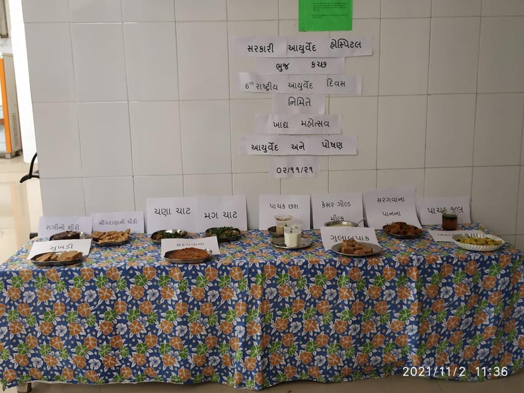 આયુષ મંત્રાલય, ભારત સરકાર તેમજ નિયામક આયુષની કચેરી, ગાંધીનગરના નિર્દેશાનુસાર આઝાદી કા અમૃત મહોત્સવ તથા છઠ્ઠા “રાષ્ટ્રીય આયુર્વેદ દિવસ” ઉજવણી પર્વ નિમિત્તે સરકારી આયુર્વેદ હોસ્પિટલ ભુજ દ્વારા આ સાથે તારીખ ૨૫-૧૦-૨૦૨૧થી ૦૨-૧૧-૨૦૨૧ સુધી સતત વિવિધ કાર્યક્રમોનું આયોજન કરેલ તથા ભુજ હાટમાં ચાલી રહેલ મેળામાં તારીખ ૨૯-૧૧-૨૦૨૧થી ૦૨-૧૧-૨૦૨૧ સતત ૫ દિવસ અમૃતપેય ઉકાળા કેમ્પ તથા જન્મથી ૧૨ વર્ષ સુધીના બાળકોના શારીરીક માનસિક વિકાસ અર્થે અતિ ઉત્તમ એવા સુવર્ણપ્રાશન સંસ્કાર કેમ્પ તથા ઔષધી વનસ્પતી ચાર્ટ પ્રદર્શન તથા મેડિકલ કેમ્પનું આયોજન કરવામાં આવ્યુ હતુ. તા.૨/૧૧/૨૧ (ધનતેરસ) ધન્વન્તરી જયંતિ તથા છઠ્ઠા રાષ્ટ્રીય આયુર્વેદ દિવસ પર્વ નિમીત્તે અત્રેની સરકારી આયુર્વેદ હોસ્પિટલ ભુજ ખાતે ધન્વંતરી જયંતિ પર્વ ઉજવણીનું આયોજન વૈદ્ય પંચકર્મ વર્ગ-૧ વૈદ્ય બર્થા પટેલના માર્ગદર્શન હેઠળ કરવામાં આવ્યું તથા ચાલુ વર્ષના થીમ આયુર્વેદ ફોર ન્યુટ્રીશનને લઈ પોષણક્ષમ વાનગીઓનું પ્રદર્શનનું અત્રેની કચેરી સરકારી આયુર્વેદ હોસ્પિટલ ભુજ ખાતે આયોજન કરવામાં આવ્યુ હતુ. જેમા સરકારી આયુર્વેદ હોસ્પિટલ ભુતપુર્વ વૈદ્ય પંચકર્મ કમલેશભાઈ જોશી તથા ભુજ બી.એ.એમ.એસ. ડોક્ટર્સ એસોશીયેશનના વૈદ્ય રામભાઈ ગઢવી, વૈદ્ય મેહુલસિંહ ઝાલા, વૈદ્ય અમીત ત્રીપાઠી, વૈદ્ય અનિલ મજેઠીયા, વૈદ્ય વર્ષા મજેઠીયા વૈદ્ય આલાપ અંતાણી તથા વૈદ્ય મિત્રો તેમજ અન્ય સ્નેહીજનોએ ઉત્સાહપુર્વક ભાગ લીધેલ. આ કાર્યક્રમને સફળ બનાવવા સરકારી આયુર્વેદ હોસ્પિટલ ભુજ ના ડો. ઉર્વશી મોદી, ડો પાવન ગોર, રેખાબેન સોરઠીયા, ક્રિષ્નાબેન ગોર, મીત ભીંડે, વૈભવીબેન બારોટ તથા સમગ્ર સ્ટાફ મિત્રોએ જહેમત ઉઠાવી હતી.