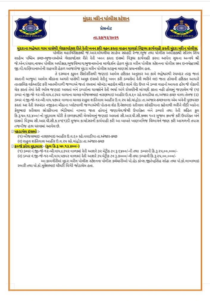 Breaking News મુંદરાના ભદ્રેશ્વર ગામ પાસેથી ગેરકાયદેસર રીતે રેતી ખનન કરી વહન કરતા વાહન ચાલકો વિરૂધ્ધ કાર્યવાહી કરતી મુંદરા મરીન પોલીસ 4 years ago Kutch Care News Continue Reading Previous ભાવનગર મહાનગરપાલિકા સદન સુધીની ૪ કિલોમીટર સુધી ફિટ ઈન્ડિયા ફિટ ગુજરાત સાયક્લોથોન રેલી યોજાઈNext કવિઓ જૈન મહાજન દ્વારા વિવિધ સેવાકીય કાર્યો કરાયા More Stories Breaking News Gujarat મોન્થા વાવાઝોડું અતી ઝડપમાં : આજે સાંજે આંધ્રપ્રદેશના દરિયા કિનારે ત્રાટકી અને તાંડવ કરશે 11 hours ago Kutch Care News Breaking News India ભારતની સ્ટાર ખેલાડી પીવી સિંધુએ બેડમિન્ટનથી લીધો બ્રેક : 2025 માં બાકી રહેલી BWF ટૂર ઇવેન્ટ્સમાં નહીં બને ભાગીદાર 12 hours ago Kutch Care News Breaking News Kutch LIC માત્ર સંસ્થા જ નહીં, એક એવં વચન જેના પર લોકોનો વવશ્વાસ અટલ છે! 12 hours ago Kutch Care News