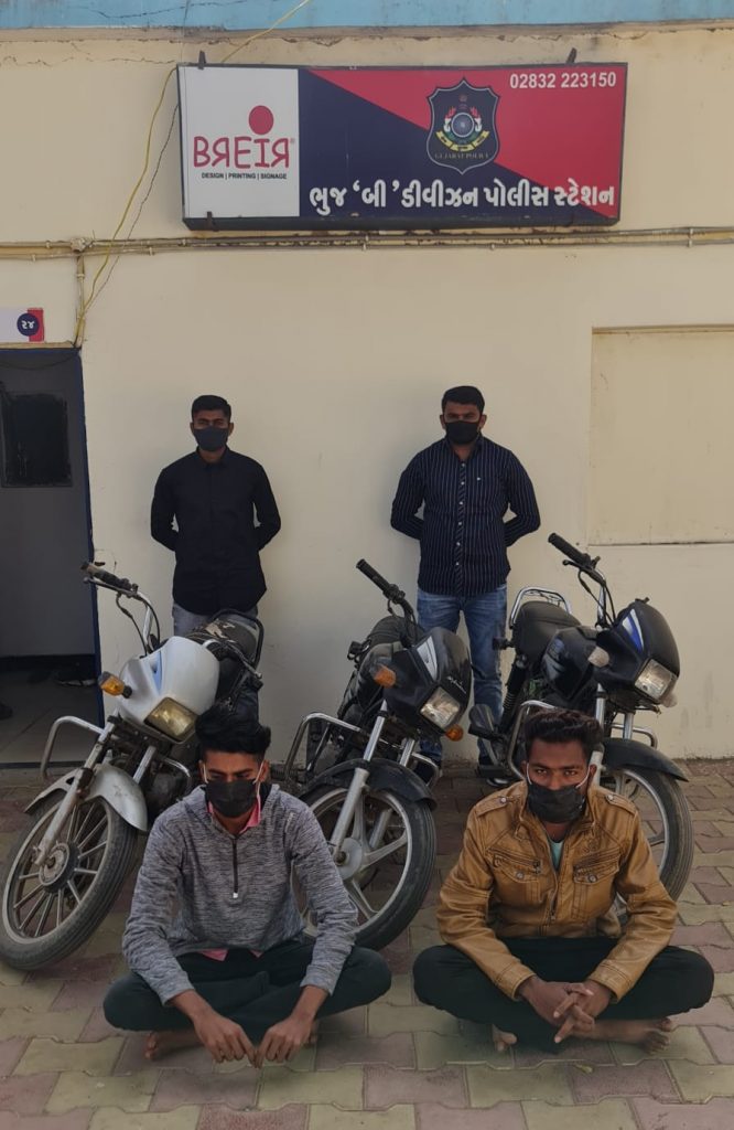 પોલીસ મહાનિરીક્ષકશ્રી જે.આર.મોથાલીયા સાહેબ રેન્જ, ભુજ તથા શ્રી સૌરભસીંઘ સાહેબ, પોલીસ અધિક્ષક, પશ્ચિમ કચ્છ, ભુજનાઓની સુચના મુજબ તથા નાયબ પોલીસ અધિક્ષકશ્રી જે.એન. પંચાલ સાહેબના માર્ગદર્શન હેઠળ પોલીસ સ્ટેશન ખાતે દાખલ થયેલ વણશોધાયેલ ગુન્હાઓ શોધવા માટે જરૂરી સુચના આપેલ. જે અનુસંધાને ભુજ શહેર બી ડિવિઝન પોલીસ સ્ટેશનના પો.ઇન્સશ્રી ડી.આર. ચૌધરીનાઓના માર્ગદર્શન હેઠળ ભુજ શહેર બી ડિવિઝન પોલીસ સ્ટેશનના સર્વલન્સ સ્ટાફના માણસો પેટ્રોલીંગમાં હતા. તે દરમ્યાન ગઈ તા. 21/01/2022 ના રોજ પો.હેડ.કોન્સ. મયુરસિંહ ઇન્દ્રસિંહ જાડેજા તથા પો.કોન્સ. પૃથ્વીરાજસિંહ ડી જાડેજા નાઓને ખાનગી રાહે બાતમી હકીકત મળેલ કે શાકીર મેમણ રહે. મેમણ કોલોની, ભુજ વાળો જે અમનગર ચાર રસ્તા પાસે કોઈ કોગ્રીઝેબલ ગુનો કરવાના ઇરાદે ફરે છે અને આ શાકીરે ભુજમાં અલગ-અલગ જગ્યાએથી મોટર સાયકલ ચોરીને અંજામ આપેલ છે. જેથી મજકુર ઇસમને અમનગર ચાર રસ્તા પાસેથી રાઉન્ડઅપ કરી પોલીસ સ્ટેશન લાવી મજકુર પર જી.પી એક્ટ કલમ 122 (સી)મુજબ કાર્યવાહી કરેલ અને મજકુર ઇસમની યુક્તિપ્રયુકતીથી પુછપરછ કરતાં પોતે કેમ્પ એરીયા ભુજના રહેતો અસગરઅલી ઉર્ફે અરમાન સૈયદ ભુજવાળા સાથે મળી ભુજ શહેર વિસ્તારમાં જુદી-જુદી જગ્યાએથી કુલ્લે 04 મોટર સાયકલ ચોરેલાની કબુલાત આપતો હોઈ જેથી મજકુર ઈસમ અલીઅસગર ઉર્ફે અરમાન અકબશા સૈયદને કેમ્પ વિસ્તારમાંથી રાઉન્ડઅપ કરી બંને ઇસમો પર સી.આર.પી.સી.કલમ 41(1) (ડી) મુજબ અટક કરી મજકુર આરોપીઓ પાસેથી ત્રણ સ્પલેન્ડર મોટર સાયકલ રીકવર કરવામાં આવેલ તથા મજકુર આરોપી શાકીર હમીદ મેમણે કેમ્પ એરીયા ભુજમાં રહેતો હનીફ અબ્દુલ ખલીફા સાથે મળીને આજથી 4 માસ અગાઉ ભીડનાકા આઝાદચોક પાસે શ્રીજ્યા એજન્સીના વેપારીને છરી બતાવીને રોકડા રૂ.27,000 તથા 2 મોબાઈલ ફોનની ચીલઝડપ કરેલાની કબુલાત આપેલ છે. નીચે મુજબના ગુના ડીટેક્ટ કરેલ છે. તથા આગળની કાર્યવાહી સારૂ મજકુર ઇસમને ભુજ શહેર એ ડિવિઝન પોલીસ સ્ટેશને સોપવવામાં આવેલ છે.04 મોટર સાયકલમાંથી 03 મોટર સાયકલ આરોપીઓ પાસેથી રીકવર કરવામાં આવેલ છે. તથા મજકુર આરોપીઓએ માંડવીમાં રહેતા પોતાના ઓળખીતાઓને 1 મોટર સાયકલ વેચી નાખેલ હતી. તે મોટર સાયકલ માંડવી પોલીસ સ્ટેશન ખાતે માંડવી પોલીસ દ્રારા સી.આર.પી.સી કલમ 102 મુજબ કબ્જે કરેલ છે. આ કામગીરી પ્રો.પો ઇન્સશ્રી ડી.આર.ચૌધરીના માર્ગદર્શન હેઠળ એ.એસ.આઈ. પંકજકુમાર આર.કુશવાહા તથા પો.હેડ.કોન્સ. મયુરસિંહ ઇન્દ્રસિંહ જાડેજા તથા પો.કોન્સ શક્તિસિંહ વી જાડેજા એ તથા પૃથ્વીરાજસિંહ જાડેજા રીતેના પોલીસ સ્ટાફના માણસોએ જોડાય સફળ કામગીરી કરેલ.