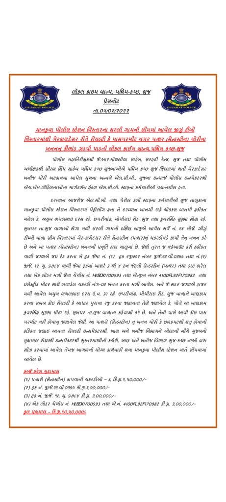 Breaking News માનકુવા પોલીસ સ્ટેશન વિસ્તારના સરલી ગામની સીમમાં આવેલ જીરું ટીબો વિસ્તારમાંથી ગેરકાયદેસર રીતે રોયલ્ટી કે પાસપરમીટ વગર પત્થર (સેન્ડસ્ટોન) ચોરીના ખનનનું કૌભાંડ ઝડપી પાડતી લોકલ ક્રાઈમ બ્રાન્ચ, પશ્ચિમ કચ્છ-ભૂજ 4 years ago Kutch Care News Continue Reading Previous રોહિકા ગામ સુધીનો બે કિલોમીટરનો એપ્રોચ રોડ ગાબડાનો સમુંદર અને મગરની પીઠ સમાન જોવા મળ્યોNext અંજાર તાલુકામાં પંચાયતની સામાન્ય સભા યોજવામાં આવી More Stories Breaking News Crime Gujarat અમદાવાદમાં IT વિભાગે સપાટો બોલાવ્યો : 50 લોકરની તપાસમાં 17 કરોડ કેશ અને 35 કરોડનું સોનું જપ્ત : 10 લોકરની તપાસ હજુ પણ જારી 14 hours ago Kutch Care News Breaking News Crime Kutch વડવાળા ગામની સીમમાંથી પ્રોહિબિશન કટિંગ’નું મોટું કૌભાંડ ઝડપાયું : ₹5.09 કરોડ નો મુદ્દામાલ જપ્ત 16 hours ago Kutch Care News Breaking News Kutch ભુજ હાટ ખાતે પાંચ દિવસીય ઊન એક્સ્પોનું ઉદ્ઘાટન : કચ્છમાં હાથશાળ અને પશુધન આજીવિકાને પ્રોત્સાહન આપવાની પહેલ 16 hours ago Kutch Care News