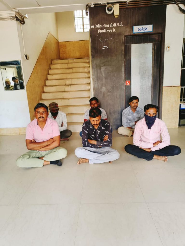સરહદી રેન્જ ભુજના મહે. પોલીસ મહાનિરીક્ષક શ્રી જે. આર. મોથલીયા સાહેબ તથા પુર્વ કચ્છ ગાંધીધામના પોલીસ અધિક્ષક સાહેબ શ્રી તથા નાયબ પોલીસ અધિક્ષક શ્રી એમ.પી. ચૌધરી સાહેબ અંજાર વિભાગ અંજારનાઓની સુચના આધારે અંજાર પોલીસ સ્ટેશન વિસ્તારમાં દારૂ/જુગારના કેશો શોધવા સુચના કરેલ હોઈ જે અન્વયે પોલીસ ઈન્સ્પેકટર શ્રી એસ.એન. ગડડુ અંજાર પોલીસ સ્ટેશન નાઓને ખાનગી રાહે બાતમી હકીકત મળેલ કે, અંજાર મધ્યે મટન માર્કેટમાં આવેલ સિમેન્ટના ખુલ્લા ઓટલા ઉપર અમુક ઇસમો જાહેરમાં ધાણીપાસા વડે રૂપિયાની હાર-જીતનો જુગાર રમતા હોવાની ચોક્કસ હકીકત આધારે સ્ટાફના માણસો સાથે હકીકત વાળી જગ્યાએ રેઇડ કરી રોકડ રૂપિયા 10,410,ધાણીપાસા નંગ 2, એમ કુલ કિંમત રૂ. 10,410 ના મુદામાલ સાથે મળી આવેલ આરોપીઓ જુસબશા જમનશા શેખ ઉ.વ. 30 રહે. પુલીયાની બાજુમાં, હેમલાઇ ફળિયું, શેખટીંબો, અંજાર, મુસ્તફા જમનશા શેખ ઉ.વ. 34 રહે. ભુજ રોડ, શેખટીંબો, અંજાર, મામદશા હાજીશા શેખ ઉ.વ. 34 રહે. તળાવની પાળની બાજુમાં, હેમલાઇ ફળિયું, શેખટીંબો, અંજાર, ઉમેદ ખીમજીભાઈ પ્રજાપતિ ઉ.વ.36 રહે. વાઘેશ્વરી ફળિયું, ઓક્ટ્રોયનાકા, અંજાર, ઈસ્માઈલશા આમદશા શેખ ઉ.વ. 42 રહે. ઈમામ ચોક, શેખટીંબો, અંજાર, કાસમશા જુસબશા શેખ ઉ.વ. 44 રહે. પુલીયાની બાજુમાં, હેમલાઇ ફળિયું, શેખટીંબો, અંજાર વાળાને ઝડપી પાડી તેના વિરૂધ્ધ કાયદેસરની કાર્યવાહી કરવામાં આવેલ છે. આ કામગીરીમાં અંજાર પોલીસ સ્ટેશનના પોલીસ ઈન્સ્પેકટર શ્રી એસ.એન. ગડડુ સાહેબ સાથે અંજાર પોલીસ સ્ટાફના માણસો સાથે રહેલ હતા.