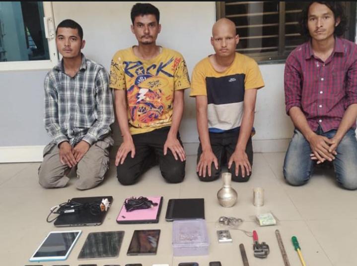 પોલીસ મહાનીરીક્ષક શ્રી જે.આર.મોથલીયા સાહેબ બોર્ડર રેન્જ ભુજ તથા પોલીસ અધિક્ષક સાહેબ શ્રી પુર્વ-કચ્છ ગાંધીધામ નાઓએ પુર્વ-કચ્છ જીલ્લામાં તથા નાયબ પોલીસ અધિક્ષક શ્રી મુકેશ ચૌધરી સાહેબ અંજાર વિભાગ અંજાર નાઓએ અંજાર વિભાગમાં મીલ્કત સબંધી વણશોધાયેલ ગુનાઓ શોધવા સુચના આપેલ હોય અને ગાંધીધામ એ-ડિવીઝન પો.સ્ટે. એ.ગુ.ર.નં ૦૩૦૪/૨૦૨૨ ઇ.પી.કો કલમ ૪૫૪, ૪૫૭, ૩૮૦ મુજબનો રાત્રી ધરફોડ ચોરીનો વણશોધાયેલ ગુનો રજી. થયેલ હોય જેથી પોલીસ ઇન્સપેક્ટર એચ.કે.હુંબલ નાઓએ ઉપરોક્ત ગુન્હો શોધવા સુચના તથા માર્ગદર્શન આપેલ હોય જે અન્વયે ગાંધીધામ એ ડિવીઝન પોલીસ સ્ટેશન પોલીસ સ્ટાફના માણસોને હ્યુમન શોર્સ તથા ટેક્નીકલ સર્વેલન્સની મદદથી મળેલ બાતમીના આધારે આરોપીઓને મુદ્દામાલ સાથે પકડી કાયદેસરની કાર્યવાહી કરવામાં આવેલ છે. પકડાયેલ આરોપી(૧) અર્જુન બલબહાદુર સાહી ઉ.વ ૨૫ રહે. રાકુ તહે. વિનાયક થાના મંગલસેન જી.અચ્છામ(નેપાળ) (૨) કમલબહાદુર ભગતબહાદુર સાહી ઉ.વ ૨૧ રહે. રાકુ તહે. વિનાયક થાના.મંગલસેન જી.અચ્છામ(નેપાળ) (૩) કમલબહાદુર જનકબહાદુર સાહી ઉ.વ ૨૪ રહે. બારલા તા.વિનાયક જી.અચ્છામ(નેપાળ) (૪) ટોપેન્દ્રબહાદુર પર્વજીતબહાદુર સાહી ઉ.વ ૨૬ રહે. બારલા તા.વિનાયક જી.અચ્છામ(નેપાળ) કબજે કરેલ મુદ્દામાલની વિગત રૂ.5,000 નું એક લીનોવો કંપનીનું લેપટોપ • રૂ.10,000 નું એચ.પી.કંપનીનું લેપટોપ • રૂ.40,000 ના 8 અલગ અલગ કંપનીના મોબાઇલ • રૂ.15,000 નાં 3 ટેબ્લોઇડ • રૂ.20,000 નુ એપલ કંપનીનું આઇપેડ • રૂ.3,000 નાં 1 જોડ ચાંદીની ઝાંઝરી રૂ. 10,000 નુ એક કેમેરો • રૂ.11,000 નો 1 ચાંદીનો જગ • રૂ.3,500 નો એક ચાંદીનો ગ્લાસ • આ ઉપરાંત નખત્રાણાના બંધ મકાનમાંથી માલમત્તા ચોરી કરવાની કબૂલાત • (1). રૂ.1,13,900ની કિંમતની સોનાની 24.6 ગ્રામની ચેન (2). રૂ.61,000 ની કિંમતની સોનાની બે બંગડીઓ • (3). રૂ.16,000 ની કિંમતની સોનાની ઝૂમ્મરવાળી 1 બુટ્ટી (4). રૂ.22,000 ની કિંમતનું એક મંગળસૂત્ર (5). રૂ.3,500 ની કિંમતની ચાંદીની પાયલ (6)રૂ.1,300 ની કિંમતની ચાંદીની બે કડલી અને ગુરુકુળ વિસ્તારના ઘરમાંથી ચોરેલું વિદેશી ચલણ પણ કબજે કરાયું