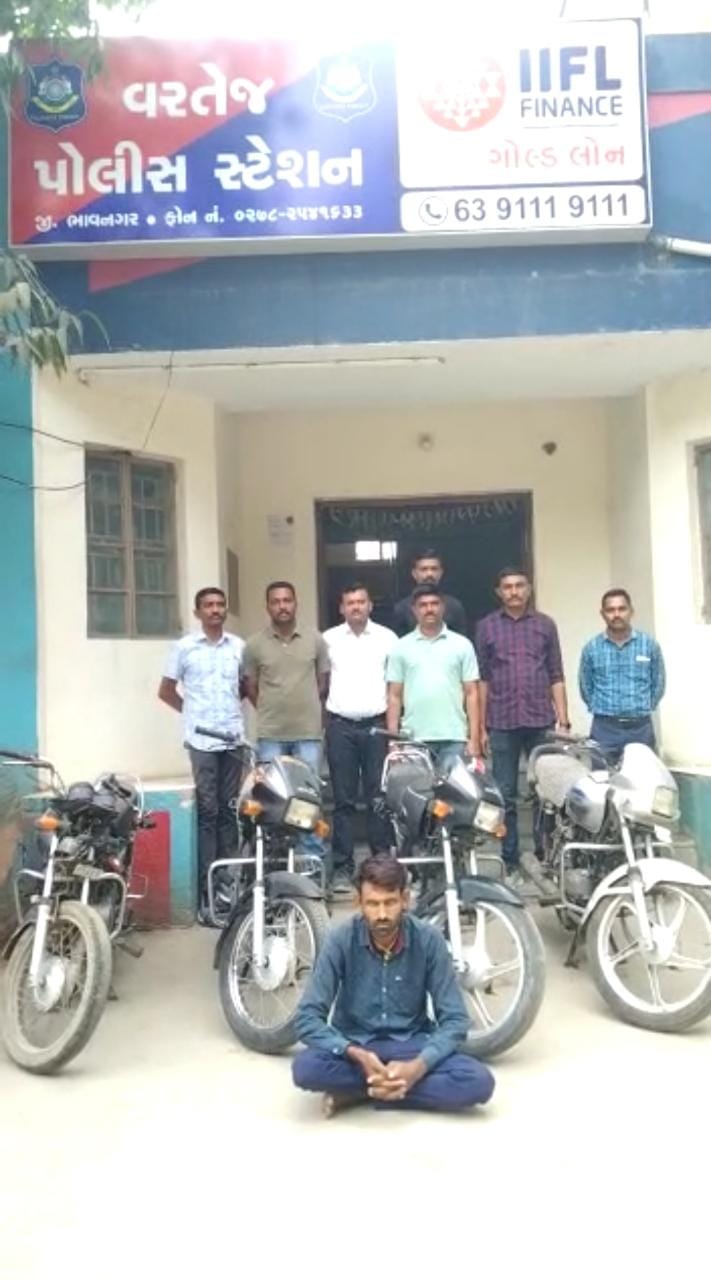 વરતેજ પોલીસ ટૌમ ભાવનગર રેન્જ પોલીસ મહાનિરીક્ષક શ્રી ગૌતમ પરમાર સાહેબ તથા ભાવનગર જિલ્લા પોલીસ અધિક્ષક શ્રી ડૉ.રવીન્દ્ર પટેલ સાહેબની સૂચના તથા નાયબ પોલીસ અધિક્ષક શ્રી આર આર.સિંઘાલ સાહેબ તથા સર્કલ પો.ઇન્સ પી.આર.મેટાલીયા સાહેબના સિધા માર્ગદર્શન હેઠળ વરતેજ પો.સ્ટે.વિસ્તારમાં મિલ્કત સબંધી ગુન્હા અટકાવવા તેમજ અનડીટેક્ટ ગુનાઓ ડીટેક્ટકરવા સુચનાઓ આપવામાં આવેલ ઉપરોક્ત સૂચના અને માર્ગદર્શન હેઠળ આજરોજ વરતેજ પોલીસ સ્ટેશનના પો.સબ ઇન્સ.શ્રી એમ.વી.રબારી તથા પોલીસ સ્ટાફના માણસો પેટ્રોલીંગમાં હતા તે દરમ્યાન બાતમી આધારે સીદસર બાયપાસ પાસેથી આરોપી મળી આવતા પુછપરછ દરમ્યાન નીચે મુજબની ચાર મોટર સાઇકલ સાથે પકડાઇ જતા કાયદેસરની કાર્યવાહી કરવામાં આવેલ.