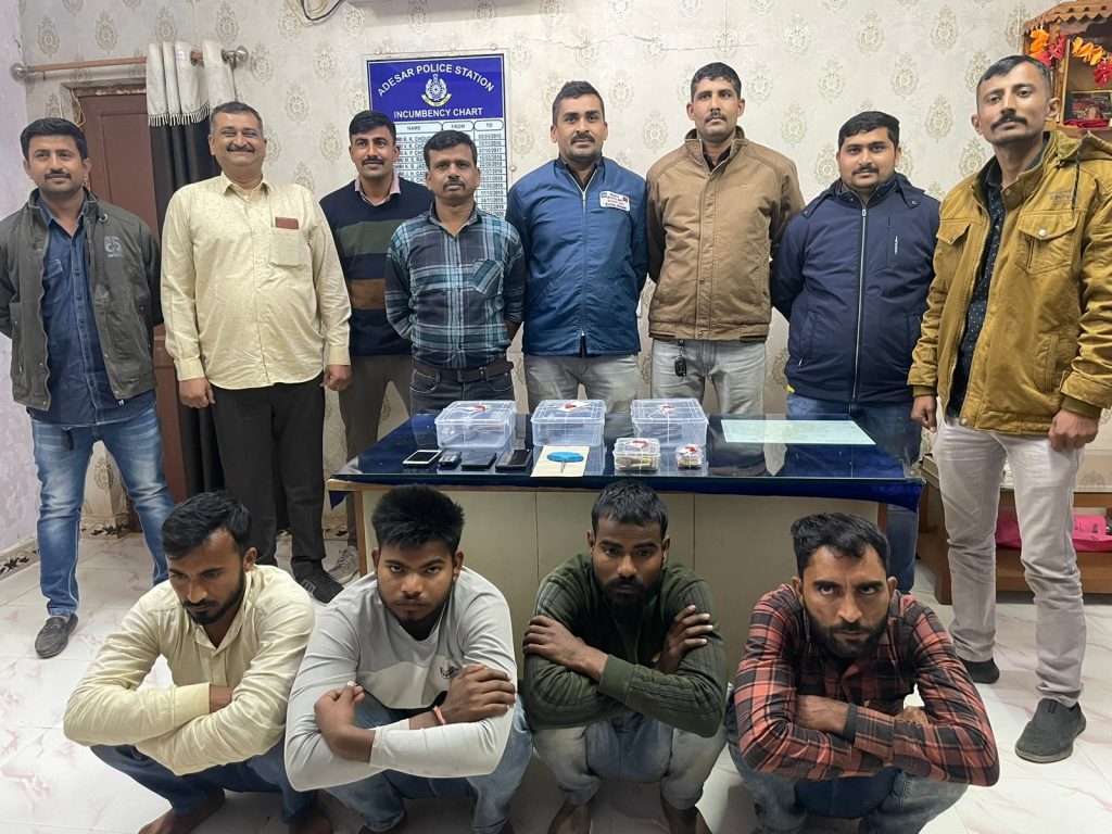 આડેસર પોલીસ ચેકપોસ્ટ પાસે પોલીસે પૂર્વ કચ્છમાં બાઈક ચોરી કરતી ગેંગના ચાર શખ્સને હથિયારો સાથે ઝડપી પાડયા હતાં.’ આ કાર્યવાહી દરમ્યાન લૂંટ અને બાઈક ચોરીના છ જેટલા ગુનાનો ભેદ ઉકેલાયો હતો.’ ઝડપાયેલા શખ્સો પૈકી બે જણા સામે અન્ય રાજ્યોમાં પણ’ ગંભીર ગુના નોંધાયેલા છે. પોલીસના સત્તાવાર સાધનો પાસેથી મળતી વિગતો મુજબ’ બાતમીના આધારે’ પૂર્વ કચ્છ સ્થાનિક ગુનાશોધક શાખા અને આડેસર પોલીસે ગત સાંજે આરોપીઓ અશોક ઉર્ફે આર્યન રમેશ નિમ્બારામ પ્રજાપતિ, અભિલેષ સુરેશ જાટવ, દિપક ભચુસીંગ કુસવાહ, અજયસિંહ બિજેન્દ્રસિંહને દબોચી લીધા હતાં.’ દોઢ મહિના પૂર્વે અંજાર ભુજ રોડ ઉપર થયેલી લૂંટના’ આરોપીઓ સાંતલપુર તરફથી’ આવવાના હોવાની બાતમી મળી હતી. જે મુજબ પોલીસ દ્વારા આડેસર ચેકપોસ્ટ પાસે સઘન વાહનચેકિંગ કરાયું હતું.’ આ દરમ્યાન પગદંડી રસ્તા ઉપર ચાર શખ્સ બેગ લઈને પગપાળા ચાલતા હતા. પોલીસે તેમને પડકારાતાં આરોપીઓએ દોટ લગાવી હતી, પરંતુ પોલીસ કર્મચારીઓએ પીછો કરી કોર્ડન કરી ઝડપી પાડયા હતાં.’ ચેકપોસ્ટ ઉપર લાવીને થેલામાં તપાસ કરાતાં તેમાંથી હથિયારો નીકળી પડયા હતાં. આરોપીઓના કબજામાંથી 25000ની કિંમતની એક પિસ્તલ, બે મેગેઝિન, 20 હજારની કિંમતના બે દેશી કટ્ટા, 4800ની કિંમતના 65 એમ.એમ.ના 16 રાઉન્ડ, 6300ની કિંમતના 8′ એમ.એમ.ના 21 નંગ’ રાઉન્ડ, ચાર મોબાઈલ ફોન, માસ્ટર કી, સહિતનો મુદ્દામાલ કબજે કરાયો હતો. આરોપીઓની પૂછપરછ’ દરમ્યાન અંજાર, આદિપુર અને ગાંધીધામમાં ચોરી કરી હોવાની કબૂલાત આપી હતી. હથિયારો સાથે ચોરી કરતા આરોપીઓએ ગત તા. 4-11ના અંજાર બાયપાસ ઉપર બાઈક ચોરી કરી હતી, જે રાજસ્થાન વેચી નાખી હતી. ગત તા. 9-11ના જ્યુપિટર ચાલકને આંતરી મોબાઈલ ફોન અને પર્સની લૂંટ કરી હતી, તેમાં મળેલી 10 હજારની રોકડ સરખે ભાગે વેચી હતી અને એ મોબાઈલ’ ફોન આજે પોલીસે કબજે કર્યા હતા, ગત તા. 10-11ના ગાંધીધામમાં આરફે 15 બાઈકની ચોરી કરી હતી, તેમજ તા. 11-11ના 64 બજારમાં હાર્લી ડેવીડસન બાઈકની ચોરી રાત્રિના 1 વાગ્યે કરી હતી. ત્યારે વાહન ચાલક જાગી જતા આરોપીઓએ હવામાં ફાયરિંગ કર્યું હતું. આ ઉપરાંત કે.ટી.એમ. બાઈકની ચોરી કરી તેના સ્પેરપાર્ટ અલગ કરી એન્જિન અંજારની આજુ-બાજુ ફેંકી દીધું હતું. આરોપીઓએ ગ્વાલીયરમાં પણ બાઈકની ચોરી કરી હતી.’ પિસ્તોલ અને દેશી કટ્ટા મધ્યપ્રદેશથી’ ખરીદી હતી અને તે શખ્સને પણ આરોપીઓએ એક ચોરાઉ બાઈક આપી હોવાની કેફિયત આપી હતી.આરોપી સુરેશ જાટવ વિરુદ્ધ રાજસ્થાનમાં દિહોલી અને નિહાલગંજ પોલીસ મથકમાં હત્યાનાં પ્રયાસ સહિતના જ્યારે અજયસિંહ બીજેન્દ્રસિંહ સામે પણ નિહાલગંજમાં હત્યાનાં પ્રયાસનાં બે’ ગુના નોંધાયા છે. આરોપીઓ માસ્ટર કીથી મોંઘી બાઈક ચોરી કરી જો કોઈ પ્રતિકાર કરે તો પોતાની પાસેના હથિયારથી ફાયરિંગ કરી લૂંટ પણ કરતા હોવાની મોડસ ઓપરેન્ડી ધરાવે છે. એલ.સીબી. પી.આઈ. એમ.એ