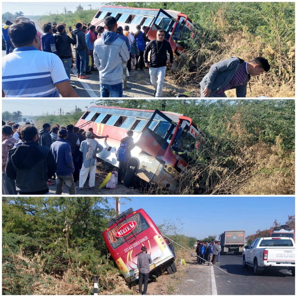 મુન્દ્રા થી ભુજ તરફ જતી ખાનગી લક્ઝરી બસ નું આગડનું ટાયર જામ થઇ જતાં સર્જાયો અકસ્માત