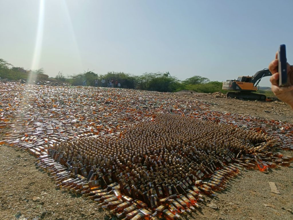 મ્હે.પોલીસ મહાનિરીક્ષક જે.આર.મોથલીયા બોર્ડર રેન્જ કચ્છ-ભુજ તથા પોલીસ અધિક્ષક મહેન્દ્ર બગડીયા પુર્વ કચ્છ-ગાંધીધામ તથા નાયબ પોલીસ અધિક્ષક શ્રી મુકેશ ચૌધરી અંજાર વિભાગ-અંજા૨ નાઓના માર્ગદર્શન મુજબ ગાંધીધામ બી ડિવિઝન પોલીસ સ્ટેશનમાં અલગ અલગ ગુન્હાઓ કામે પકડાયેલ ૫૨ પ્રાંતિય ઈંગ્લીશ દારૂના જથ્થાનો નાશ કરવા નામદાર કોર્ટના હુકમ મુજબ શ્રી મેહુલ દેસાઇ એસ.ડી.એમ. અંજાર તથા નાયબ પોલીસ અધિક્ષક મુકેશ ચૌધરી અંજાર વિભાગ-અંજાર તથા શ્રી એમ.એન.દવે પોલીસ ઈન્સ્પેક્ટર ગાંધીધામ બી ડિવિઝન પોલીસ સ્ટેશન તથા આઈ.એચ.ડોડીયા નશાબંધી અને આબકારી અંજા૨નાઓની રૂબરૂમાં ગાંધીધામ બી ડિવિઝન પોલીસ સ્ટેશન માં તારીખ:૦૧/૦૧/૨૦૨૨ થી તારીખ:૩૧/૧૨/૨૦૨૨ સુધી પકડાયેલ ૫૨ પ્રાંતિય ઈંગ્લીશ દારૂની બોટલો નંગ –૨૮,૦૯૦ તથા બીયર ટીન નંગ-૭,૪૦૬ કુલ્લે કિ.રૂ.૧,૧૫,૫૮,૦૫૦/- ના મુદ્દામાલનો નાશ શિણાય સીમ વિસ્તા૨ મધ્યે કરવામાં આવેલ છે.