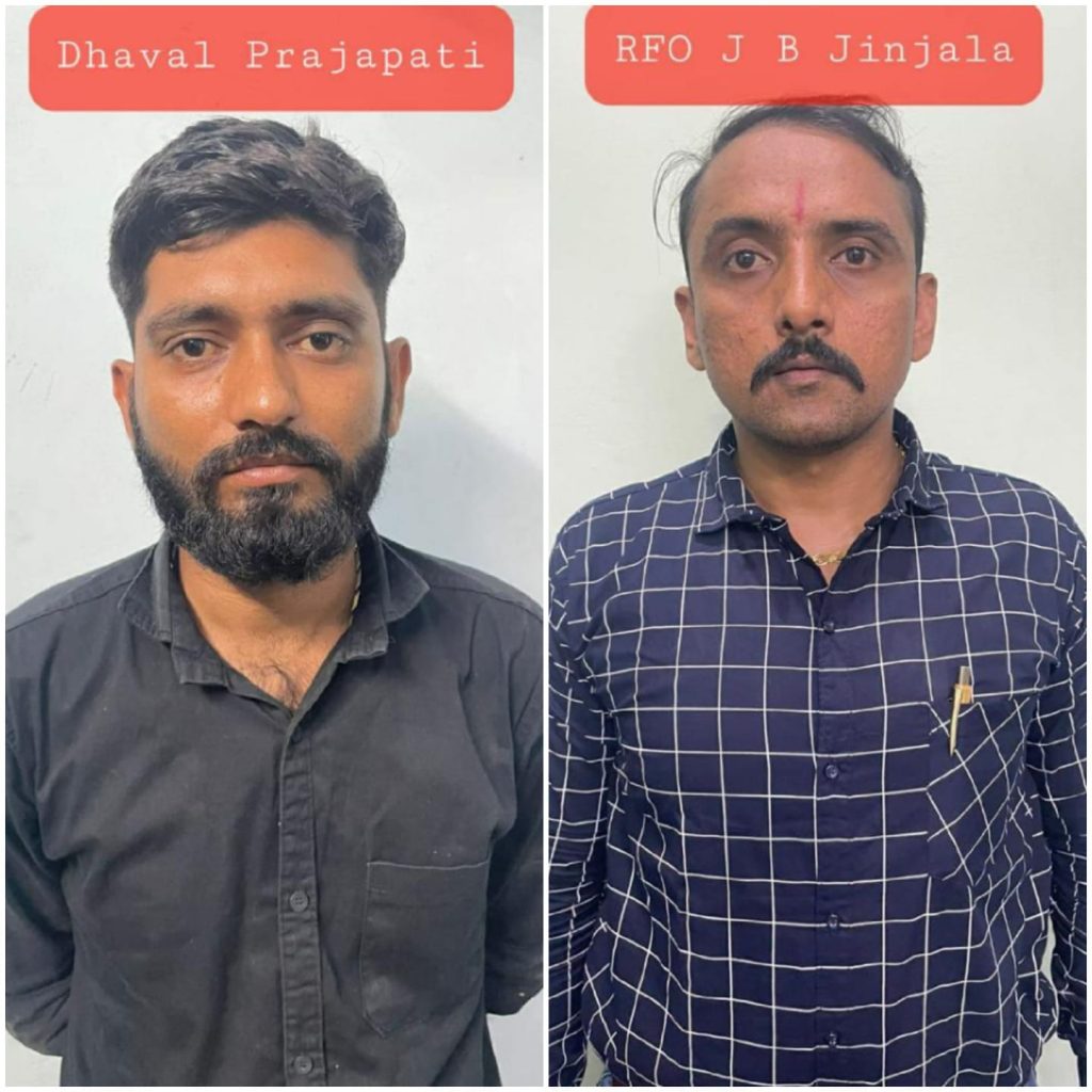 ફરીયાદીશ્રીના મોટા બાપાના દીકરાની માલીકીનું નીરવ એન્ટરપ્રાઇઝ નામનું લાકડાનું ગોડાઉન ગાંધીધામ ખાતે ધરાવે છે. જે.બી.જીંજાળા, આર.એફ.ઓ, ગાંધીધામ નાઓ તેમના વચેટીયા ધવલભાઈ પ્રજાપતિ સાથે ફરિયાદીશ્રીના ગોડાઉન ખાતે રૂબરૂ મુલાકાત લઈ ગોડાઉનની અંદર પડેલ લાકડા(પેલેટ પેકીંગ મટીરીયલ) ગેરકાયદેસર લાવી વેચાણ કરતા હોવાનુ તથા વેચાણ કરવા માટે ફોરેસ્ટ ખાતાની પરમિશન લીધેલ ન હોવાનું જણાવી, જો ફરીયાદી આ બાબતે તેઓને વ્યવહાર પેટે લાંચના રૂપીયા ૧,૦૦,૦૦૦/- નહી આપે તો ફરીયાદીના લાકડાના ગોડાઉનમાં ગેરકાયદેસરના લાકડા રાખવા તેમજ વેચાણ કરવાના ગુના બાબતે કેસ દાખલ કરી ગોડાઉનને શીલ કરી દેવાનુ જણાવેલ. પરંતુ ફરીયાદીશ્રી આ લાંચની રકમ આપવા માંગતા ન હોય એ.સી.બી.નો સંપર્ક કરી ફરીયાદ આપતા આજરોજ લાંચનું ગોઠવતાં આરોપી નં.૧.ધવલભાઇ પ્રજાપતિએ આરોપી નં. ૨. જે.બી.જીંજાળા(જીતુભાઇ આહીર) વતી રૂ.૧,00,000/લાંચ પેટે સ્વીકારી પકડાઈ ગયેલ અને આરોપી નં.૧ ધવલભાઇએ પંચો રૂબરૂ આરોપી નં.૨ જે.બી.આહિર આર.એફ.ઓને લાંચ બાબતે ટેલીફોનીક સંપર્ક કરતા આરોપી નં ૨ એ રૂ.૧,00,000/-ની લાંચ લેવા બાબતે સંમતી દર્શાવી ગુનો કરેલ છે.