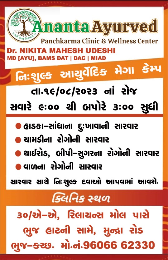 આજરોજ 30/એ -એ, રિલાયન્સ મોલ પાસે ભુજ હાથની સામે નિશુલ્ક આયુર્વેદિક મેગા કેમ્પનું આયોજન કરવામાં આવ્યું છે