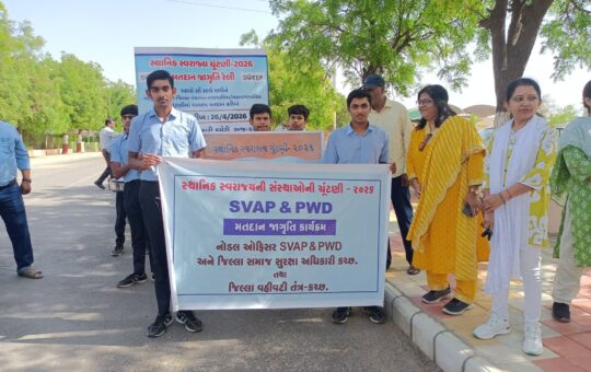 ૩૫૦ વિદ્યાર્થીઓ અને વિવિધ વિભાગોના ૬૦ અધિકારીઓ-કર્મચારીઓ 'મારો મત મારી ઓળખાણ' જેવા નારાઓ સાથે મતદાન જાગૃતિ અભિયાનમાં જોડાયા આગામી તારીખ ૨૬/૦૪/૨૦૨૬ ના...