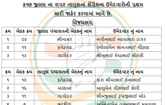 કચ્છ જીલ્લા ના રાપર તાલુકાનાં કોંગ્રેસના ઉમેદવારોની પ્રથમ યાદી જાહેર કરવામાં આવે છે.
