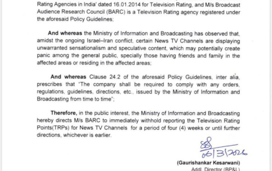 સૂચના અને પ્રસારણ મંત્રાલયે ન્યૂઝ TV ચેનલો માટે TRP રિપોર્ટિંગ તાત્કાલિક અસરથી સ્થગિત કરી આ નિર્ણય 4 અઠવાડિયા સુધી અથવા...