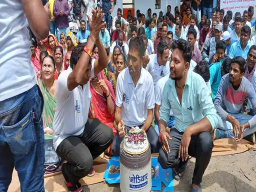 આઉટસોર્સિંગના કર્મીઓનું શોષણ દિન લખેલી કેક કાપી કરાયું વિરોધ પ્રદર્શન